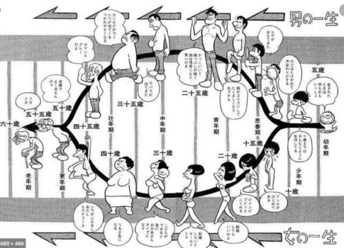 ↓ちなみに手塚治虫の描いた人間の一生がこれ…。50代の人が80~90代くらいに見えるけど、この時代はこれが普通だったのかな?サザエさんのお父さんも54歳らしいし。2020年現在、福山雅治が51歳なんだけどw