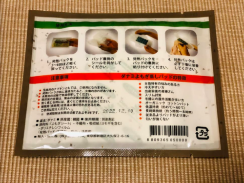 そこで、以前ちょっと話題になってたカイロ式のよもぎ蒸しパッドを思い出して買ってみたのでした。